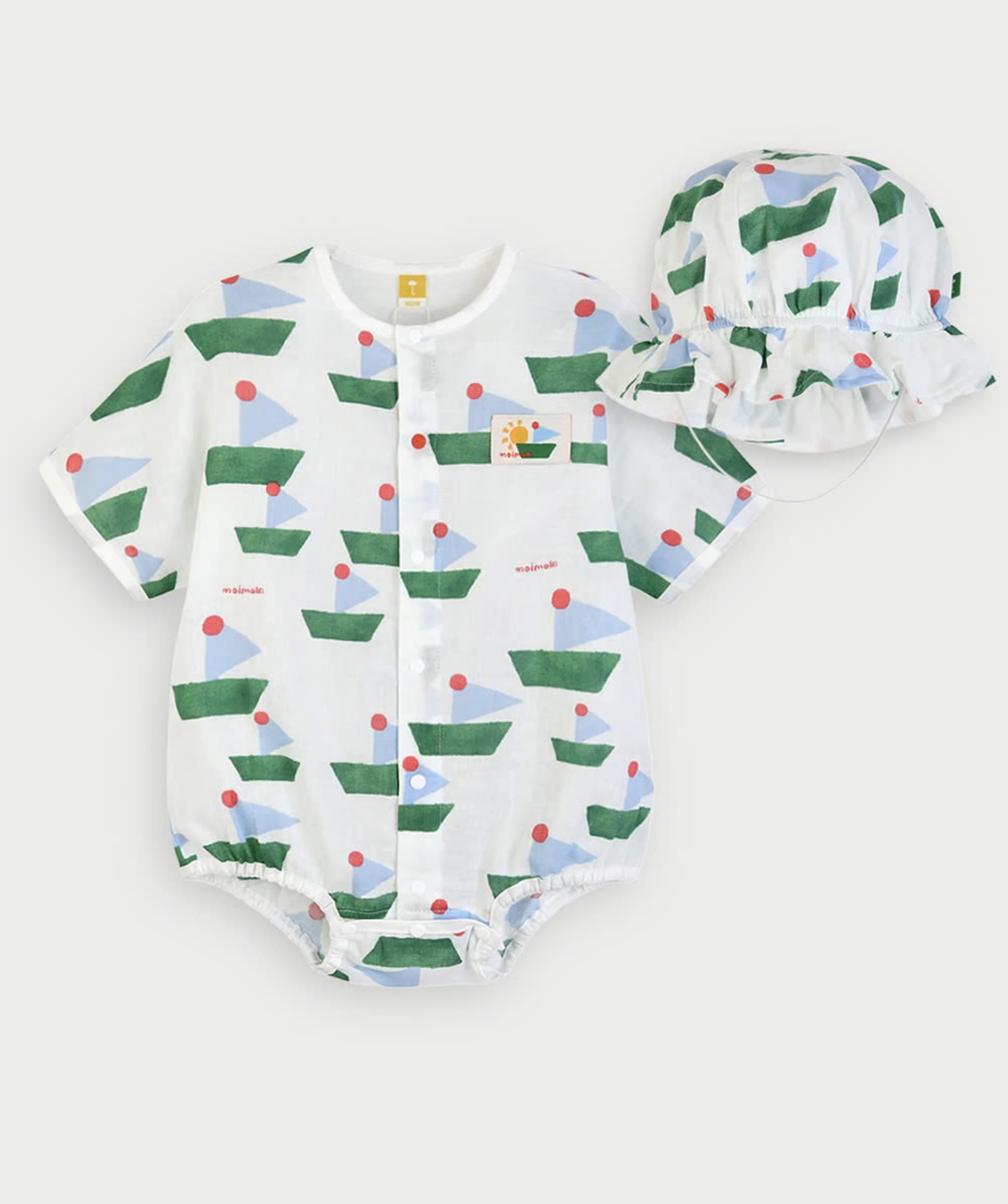 スナップボタン仕様で着脱もスムーズ、帽子付きのセットで実用性も高く、ユニークなボート柄が可愛らしいアクセントに。